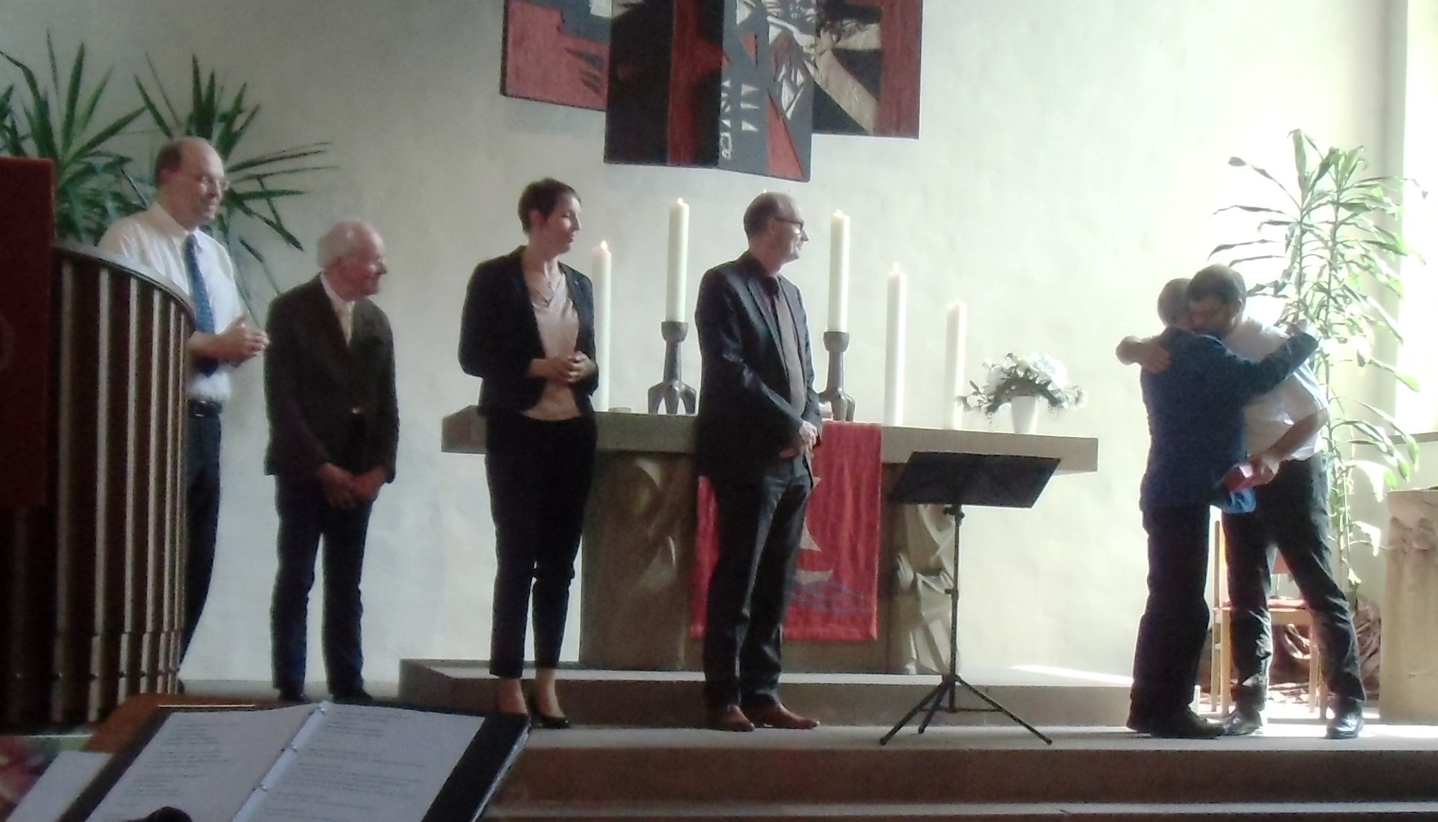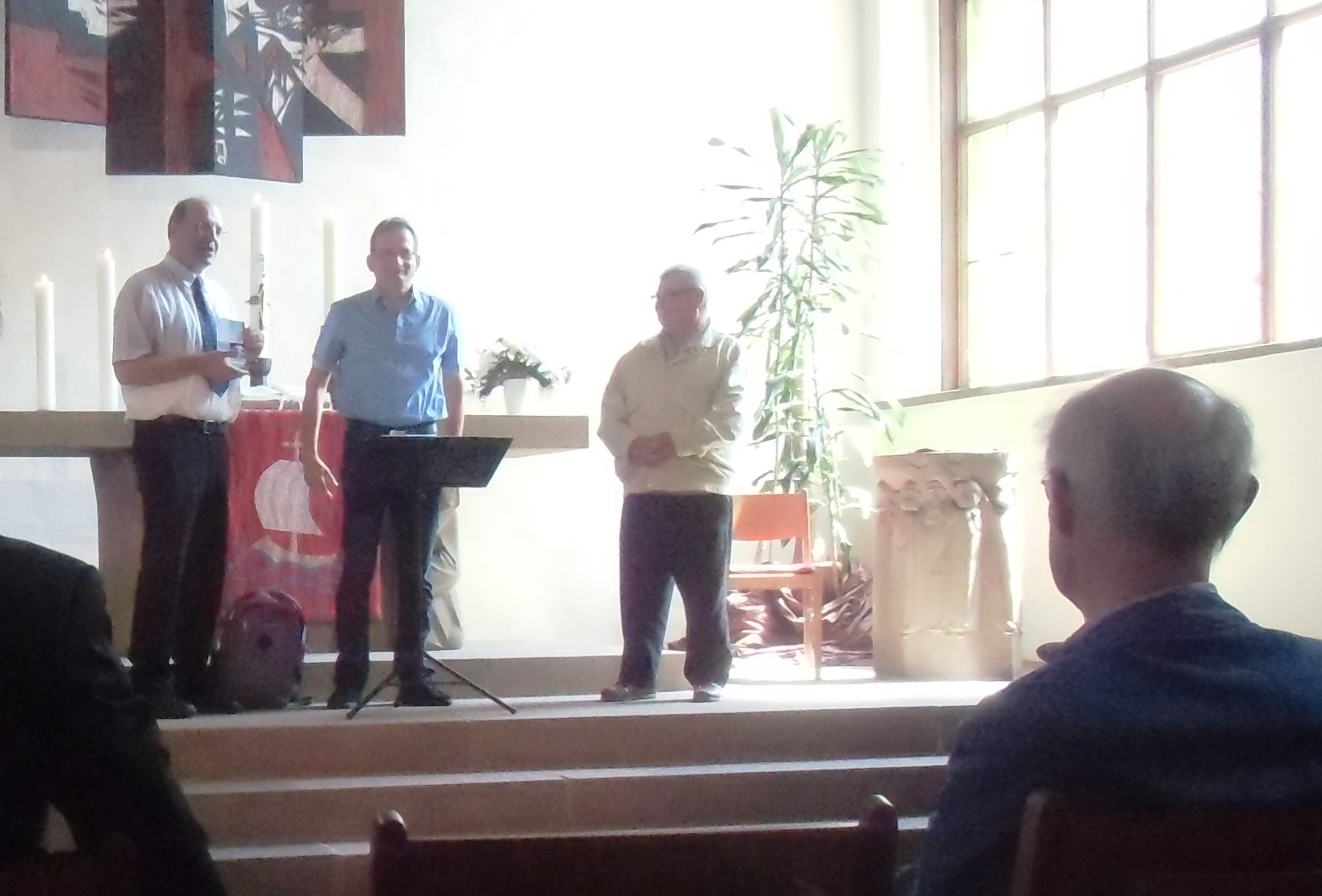 Viele Menschen waren gekommen, um sich von Herrn Trombach zu verabschieden. Viele haben auch in Grußworten und Geschenken gezeigt, wie wichtig er für sie ist. Der Vorsitzende der DAFEG, Friedhelm Zeiß, dankte dem ehemaligen Vorstandsmitglied; Pfr. Wegner, Frankfurt, dankte dem verlässlichen Kollegen; die Gemeindevorstände der Gehörlosengemeinden der EKKW, Reinhard Eckey, Frank Beilborn, Nikolai Drugin, Gertraude Peer, der Gebärdenchor Kassel, für den Ortsbund Kassel Dietrich Tschirner, für den Altenclub Kassel Bernd Siebert, die Kollegin und Kollegen aus Kurhessen-Waldeck; … alle sprachen sie ihren Dank aus und bei aller Trauer um den Abschied wünschten sie dem Ruheständler alles Gute für seinen neuen Lebensabschnitt.