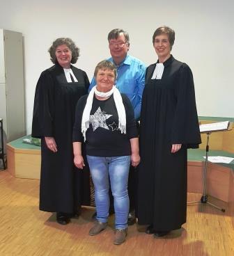 Ein Tag vorher wurden Gabriele Meyer und Sebastian Sonntag als neuer Gemeindevorstand in Hanau eingeführt; Erika Reitz und Hans Luley sind Gemeindeälteste.