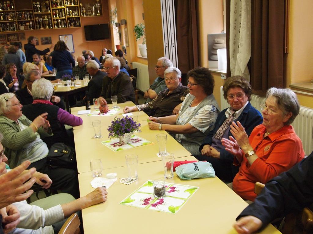 Menschen plaudern an gedeckter KaffeetafelAuch der Gebärdenchor zeigte die neu eingeübten Lieder und hat diesen Gottesdienst mitgestaltet.