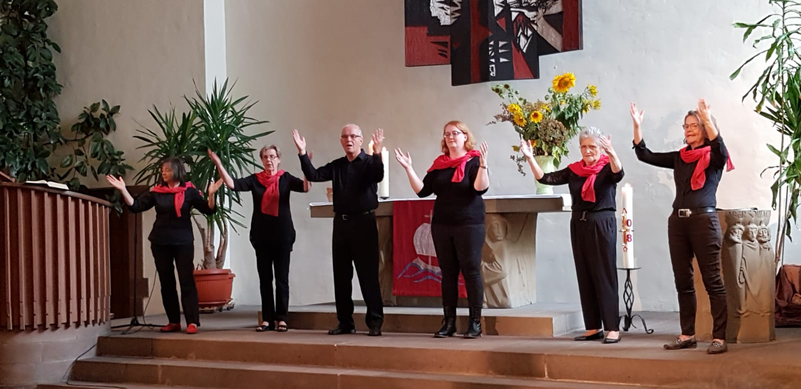 Der Gottesdienst wurde gedolmetscht und der Gebärdenchor hatte zwei Lieder für den Gottesdienst mitgebracht. Das erste Lied wurde zusammen mit der Gemeinde geübt und geplaudert.