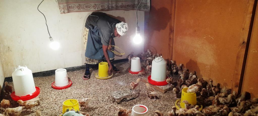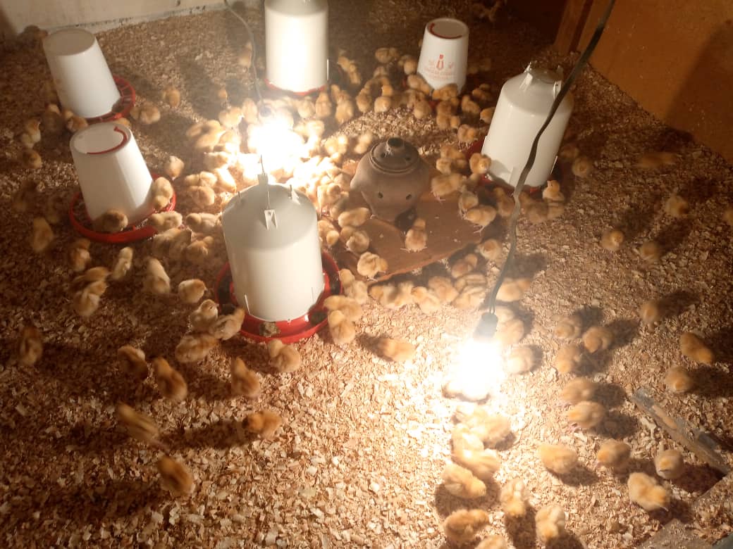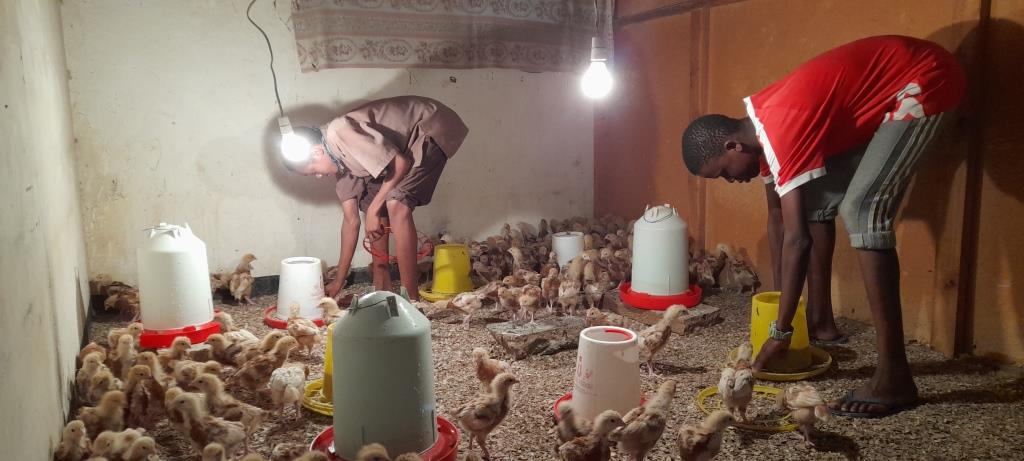 300 Küken werden aufgezogen. In einem kleinen Stall mit Wärmelampen (es ist jetzt Winterzeit), Futter und Wasserstellen. Jedes Kind soll zweimal die Woche ein Ei zum Frühstück bekommen. Jeden Morgen um halb sieben Uhr gibt es Porridge zum Frühstück. Das ist ein Brei aus Maismehl, Zucker und Wasser. Um zehn Uhr zwanzig gibt es Tee mit einem Stück Brot. Die Schüler freuen sich auf die Eier. In einem halben Jahr werden die Hühner legen. Einige Schüler helfen.
